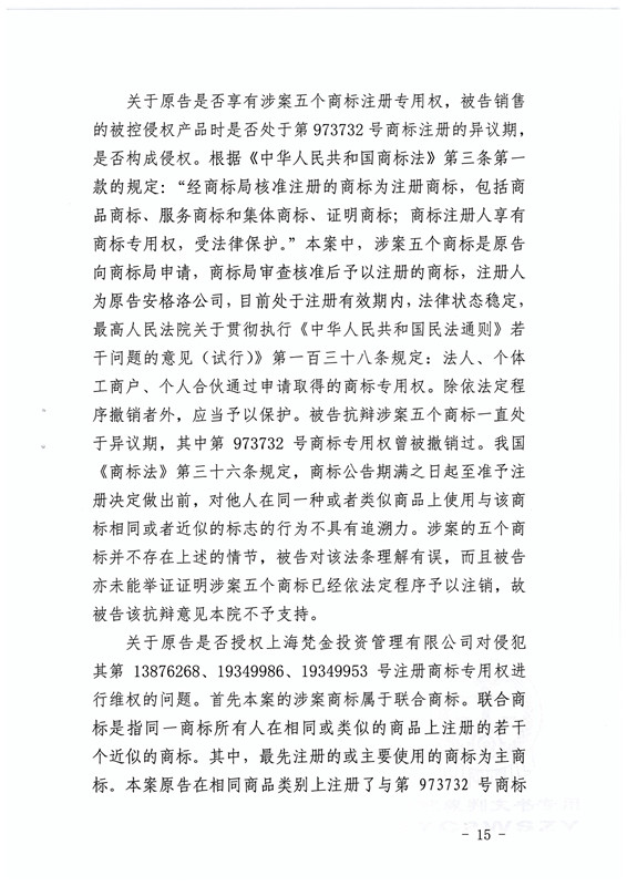 首先,涉案五个商标是原告向商标局申请,商标局审查核准后予以注册的商标,注册人为原告安格洛公司,目前处于注册有效期内,法律状态稳定。且被告未能举证证明涉案五个商标已经依法定程序予以注销,故被告该抗辩意见不予支持。