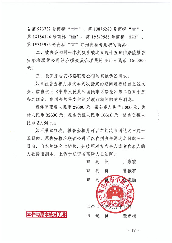 二、被告金相月于本判决生效之日起十五日内赔偿原告安格洛联营公司经济损失及合理费用共计人民币1600000元。